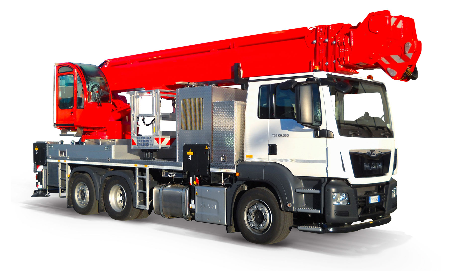 Piattaforma aerea telescopica allestita su autocarro da 27 tonnellate con altezza massima di lavoro di 42,30 m.