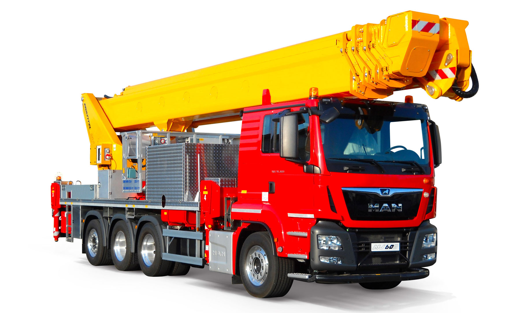 Piattaforma aerea telescopica allestita su autocarro da 32 tonnellate con altezza massima di lavoro di 60,40 m. Primo modello nella storia Multitel con questo tonnellaggio.