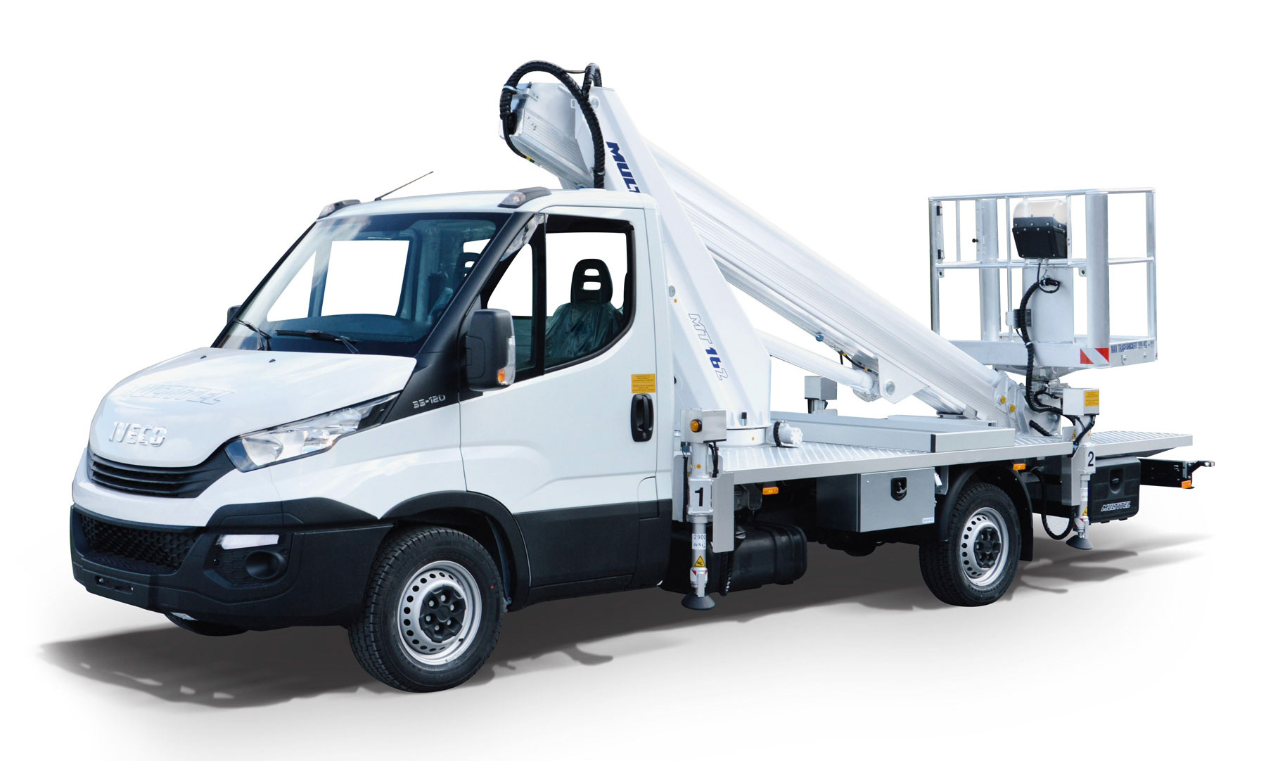 Piattaforma aerea telescopica allestita su autocarro da 3.5 tonnellate, con altezza massima di lavoro di 16,15 m.
