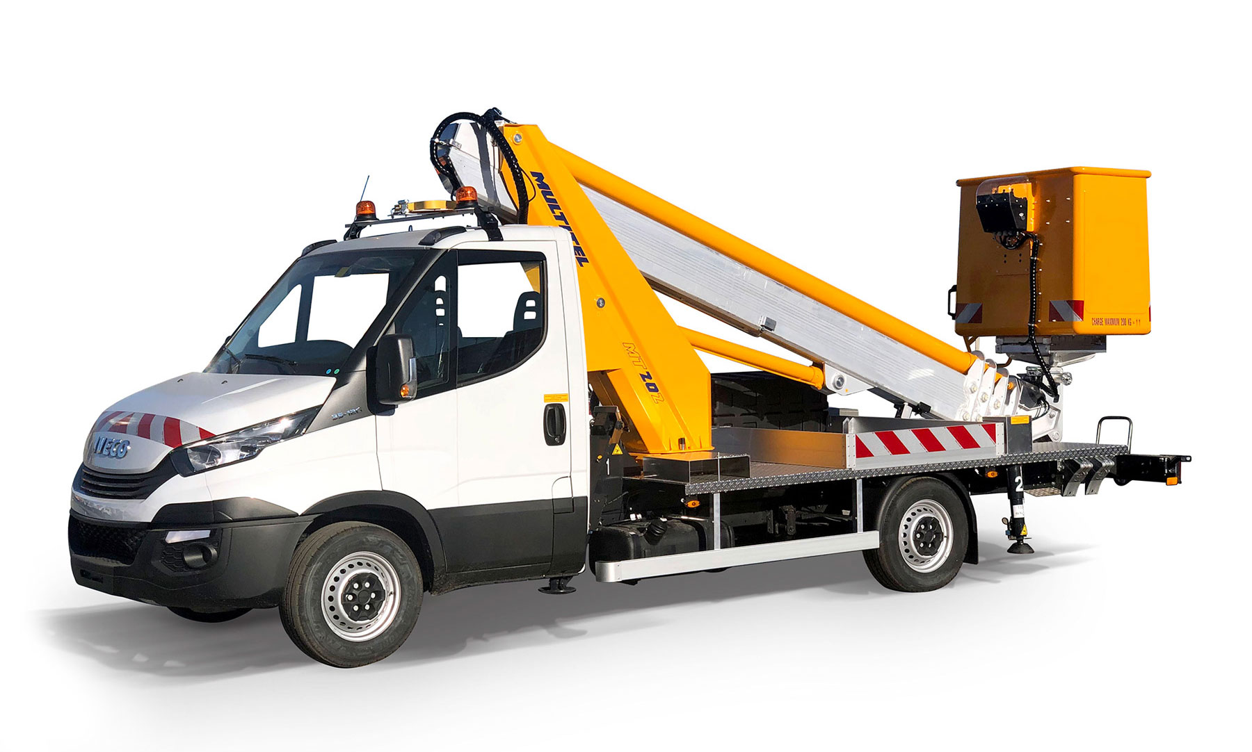 Piattaforma aerea telescopica allestita su autocarro da 3.5 tonnellate, con altezza massima di lavoro di 20,20 m.
