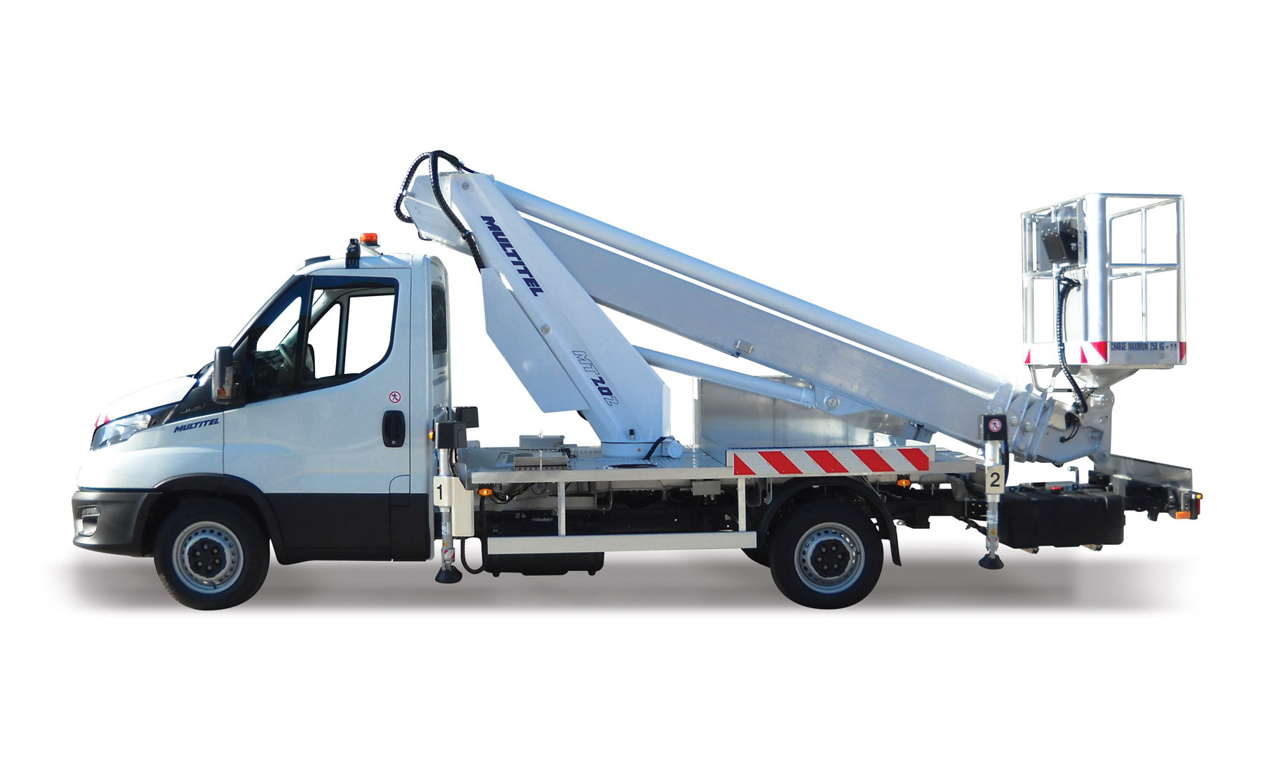 Piattaforma aerea telescopica allestita su autocarro da 3.5 tonnellate, con altezza massima di lavoro di 20,20 m.