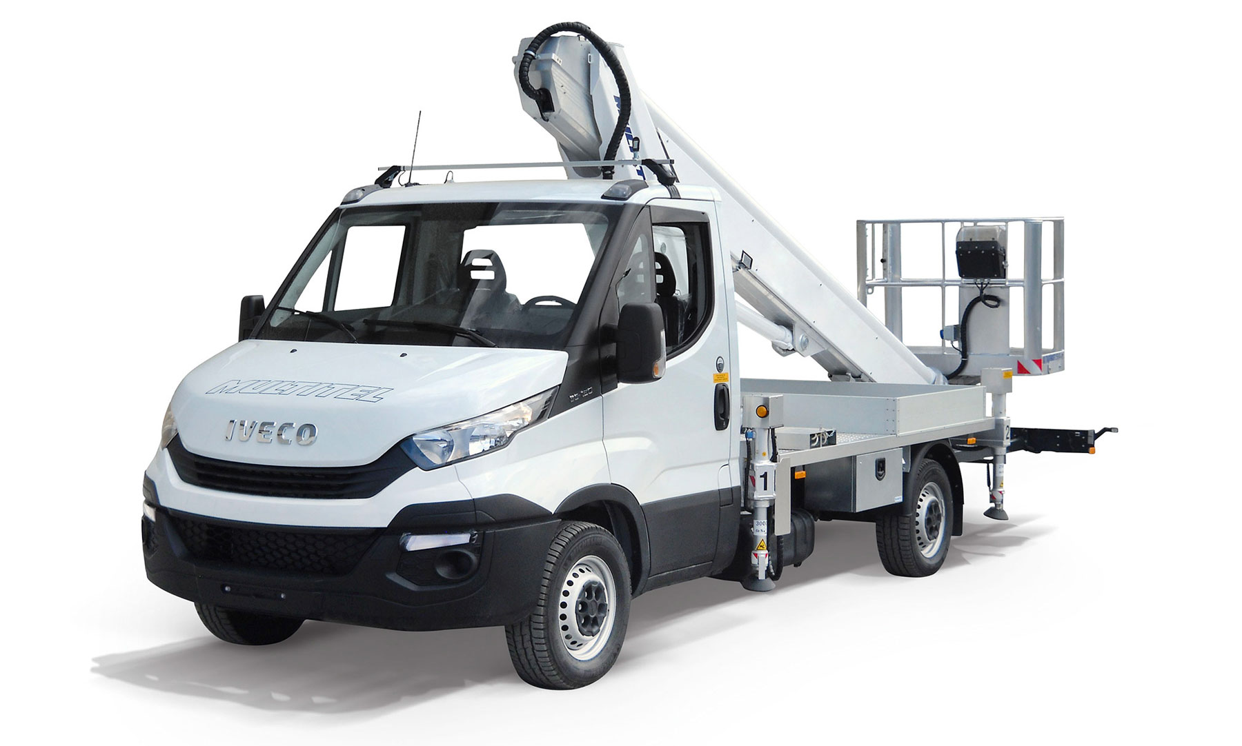 Piattaforma aerea telescopica allestita su autocarro da 3.5 tonnellate, con altezza massima di lavoro di 24 m.